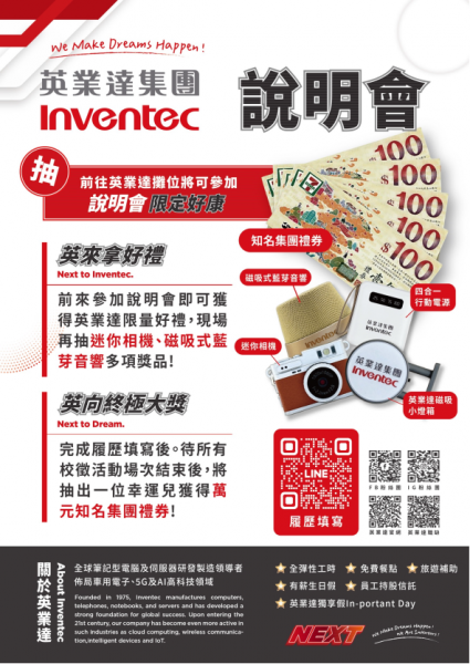 企業簡介:英業達成立於1975年,在亞洲、北美及歐洲皆設有營運據點,專注於筆記型電腦、消費性電子與伺服器產品的研發和製造,近年也持續朝車用電子、AI及元宇宙等高科技產品領域邁進。 英業達在台灣設有台北總部、桃園科技廠,分別負責筆記型電腦、消費型電子、伺服器、機櫃/網路解決方案的研發和製造。海外的生產基地則有上海浦東廠、四川重慶廠、墨西哥Juarez廠、捷克Brno廠、泰國曼谷廠等。從研發、設計、生產、到配送及技術支援,英業達以顧客需求為導向、全球營運為考量,從軟體到硬體、從台灣到全球,致力於提供全方位的產品設計及解決方案服務!